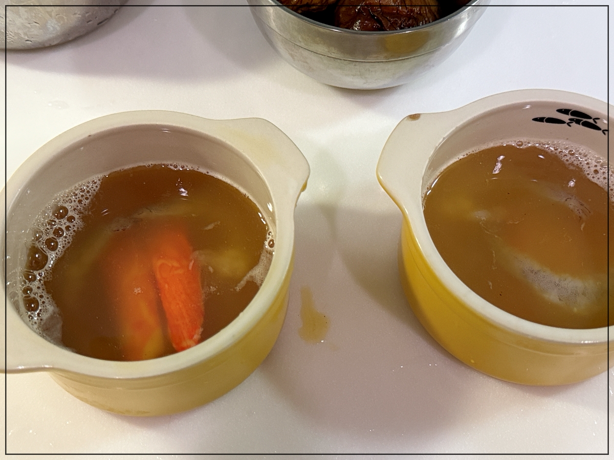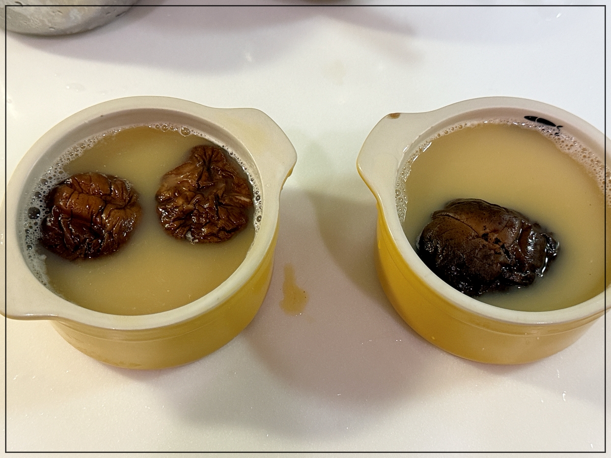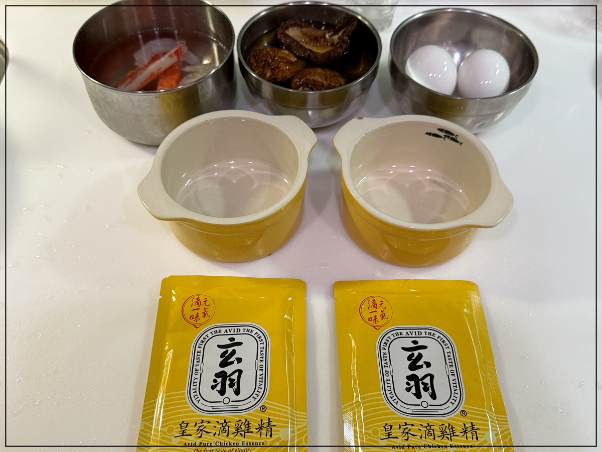 另外,滴雞精除了直接喝之外,我也很喜歡拿來做蒸蛋,滴雞精跟茶碗蒸超級搭配,作法也不困難,是家庭可以經常做的料理。原料除了滴雞精跟雞蛋之外,我是搭配蝦仁及蟹肉棒,當然你有魚板、蛤仔或是其他海鮮類都可以搭配,重點是一定要搭乾香菇,乾香菇泡水之後會散發一種迷人的香氣,非常適合茶碗蒸。