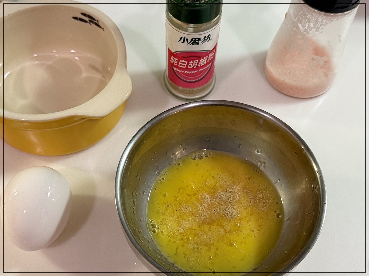 雞蛋直接全蛋打散成蛋液,加點鹽巴及白胡椒粉調味。