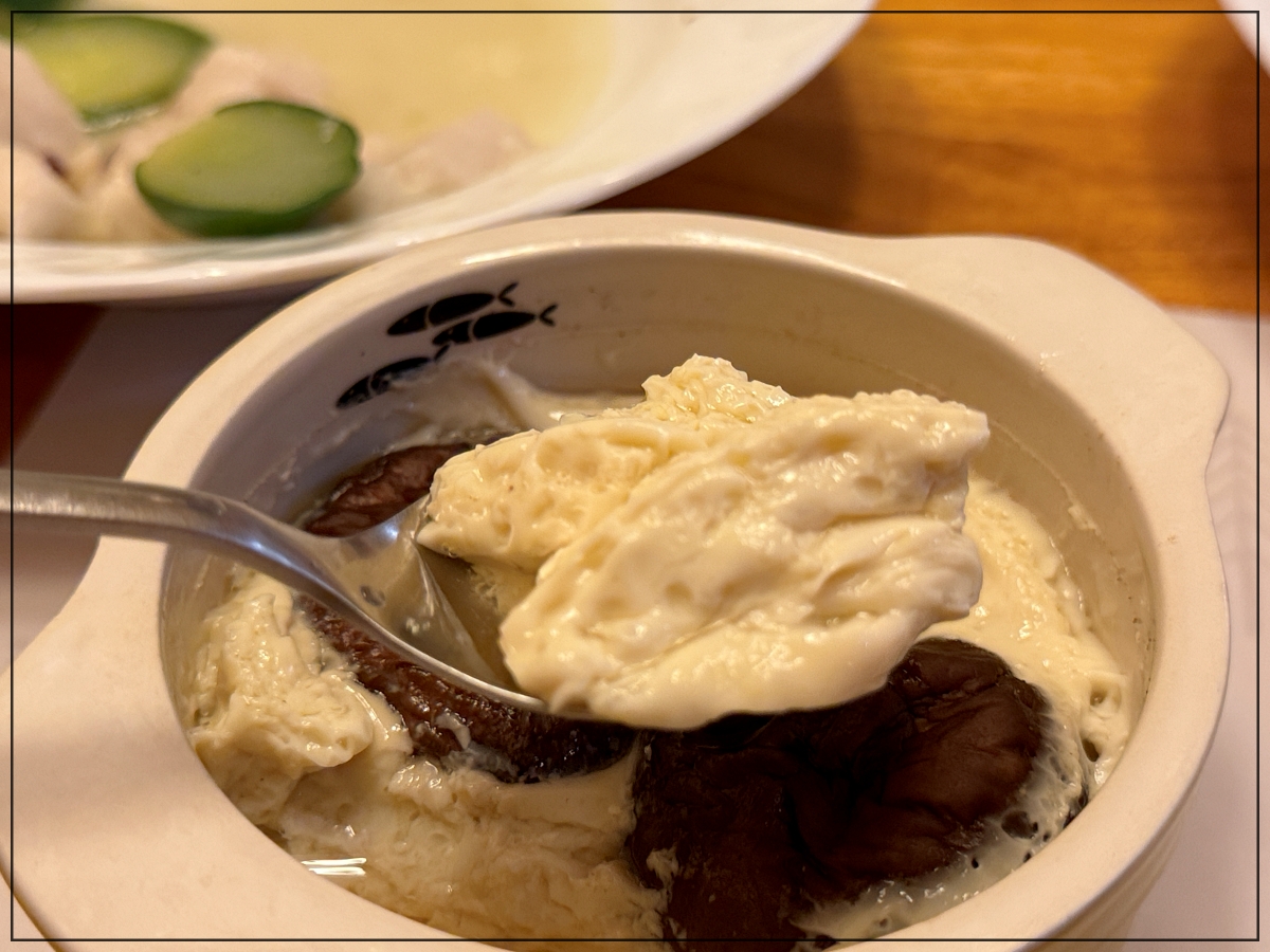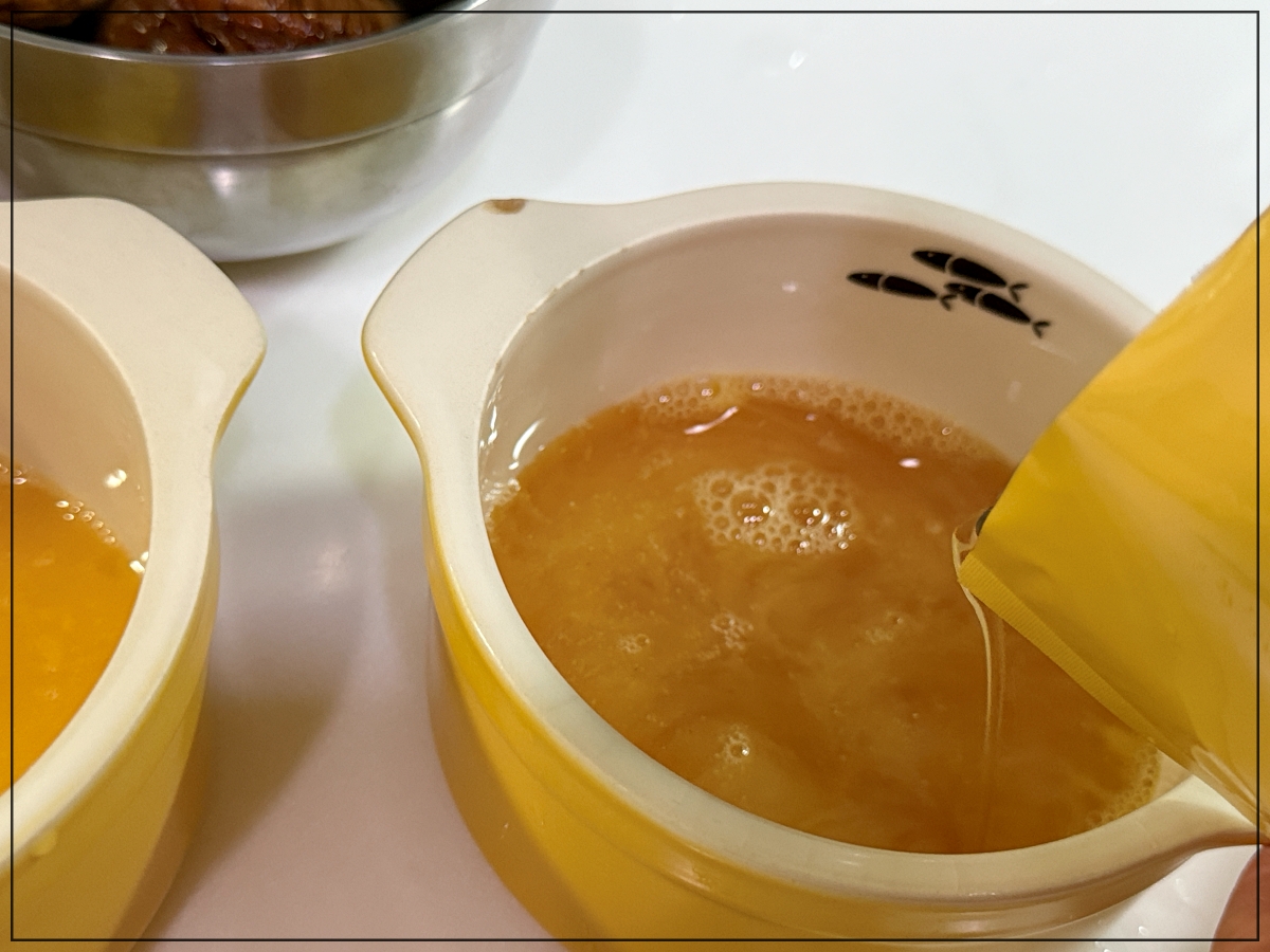 茶碗蒸混合了滴雞精,除了原本蛋液之外,可以吃到雞的鮮味,是一道既營養又美味的料理,也可以拿來拌飯增添白飯的風味。