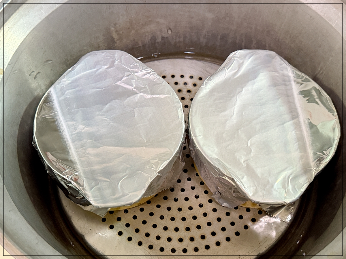 將容器包上錫箔紙,放入大同電鍋蒸,這是防止蒸的時候水蒸氣進入裡面。外鍋水要看茶碗蒸數量,如果是一碗的話放一米杯的水應該就夠,我這次蒸兩個,外鍋水放了一杯半。