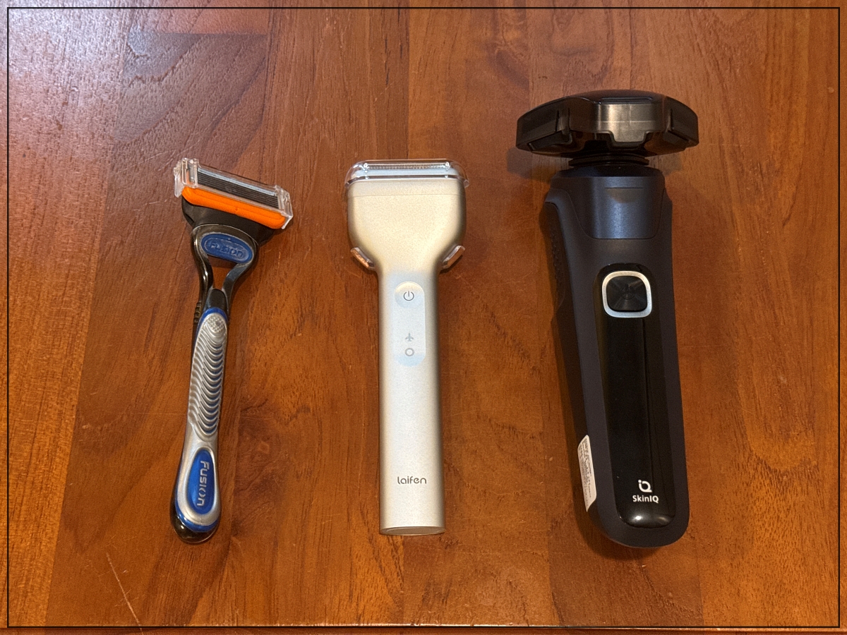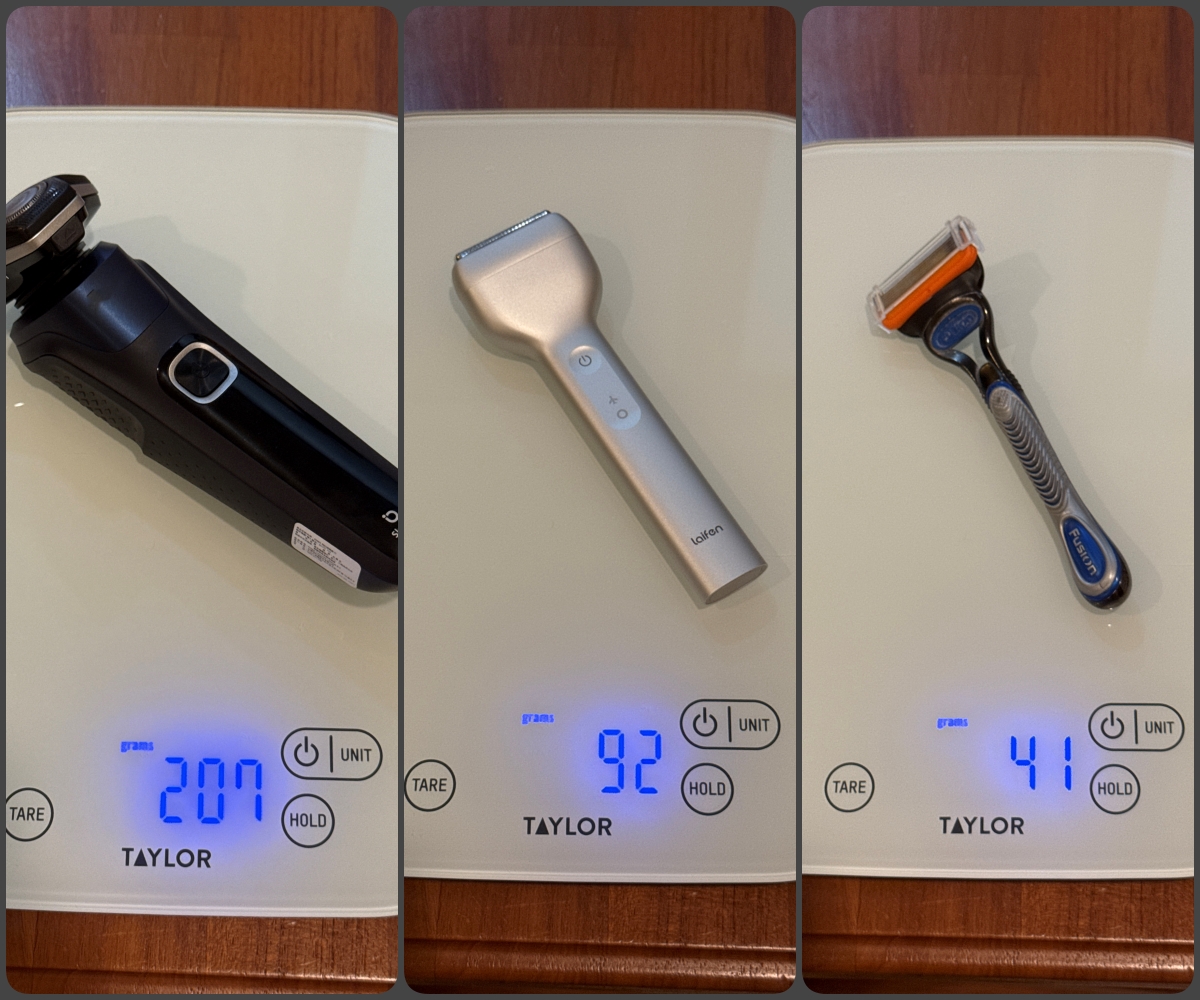 來比較一下三款刮鬍刀,就可以知道Laifen T1Pro有多輕巧,參賽選手為傳統手動刮鬍刀、Laifen T1Pro、三刀頭電動刮鬍刀。