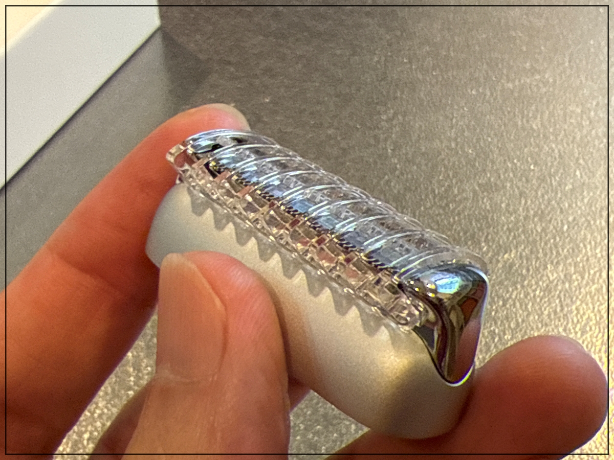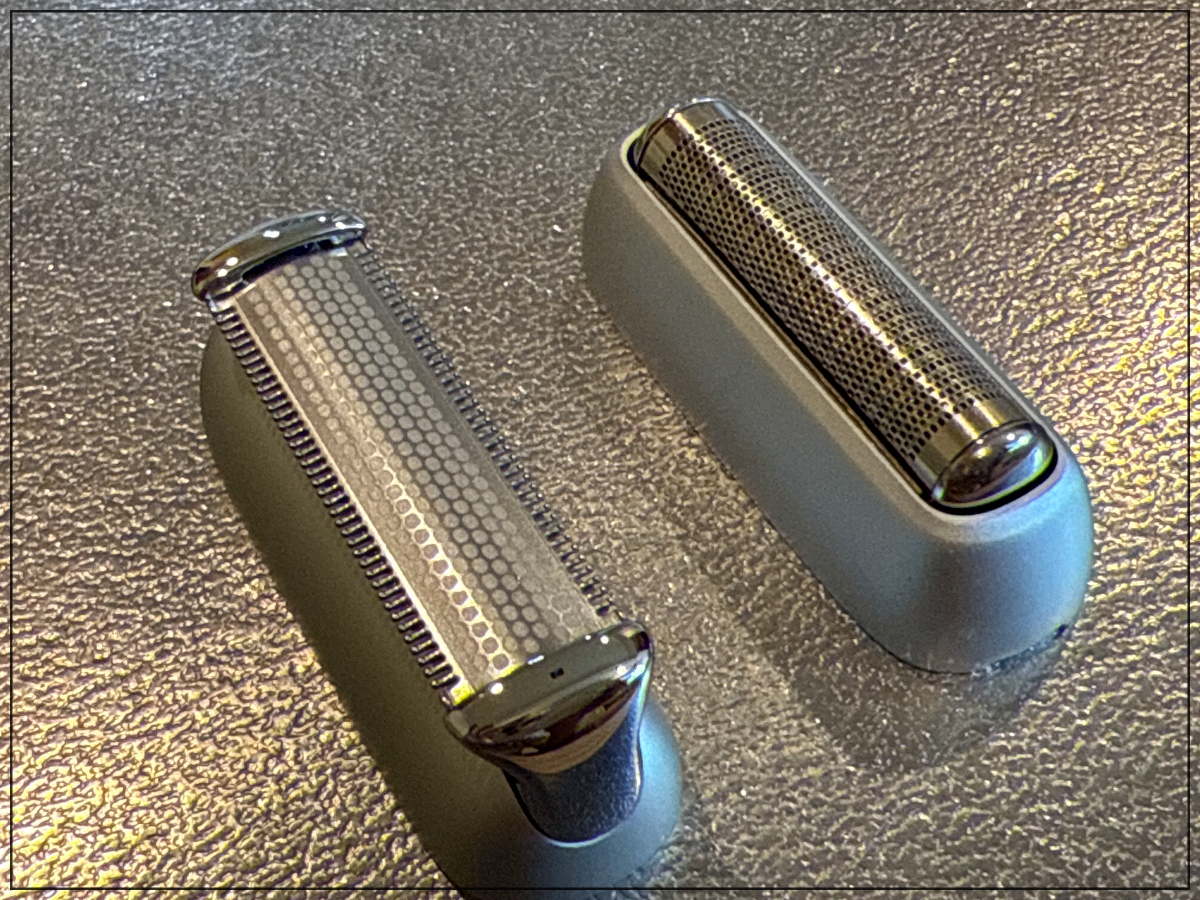 刀頭採用磁吸方式直接吸在刀座上,磁吸的力道很強,不用擔心會掉落;配件部分,除了標準刀頭之外,還有一個長鬚刀頭,拿來刮鬢角特別好用。